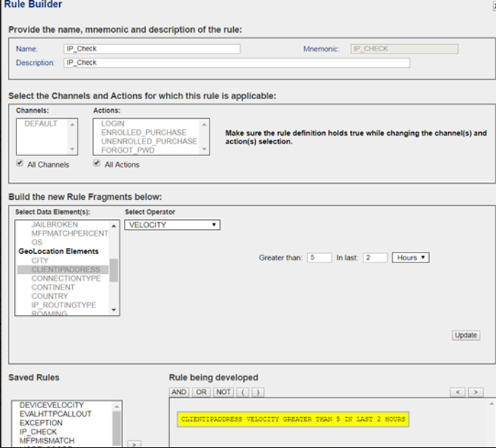Note: The IP address block should happen at the Network Firewall level. Riskfort server will process any request it gets and provides an Advise. The below rule will only help to give Stepup when IP velocity threhold is reached, it will not block. To block the transaction the rule should be given the DENY advise rather INCREASEAUTH.