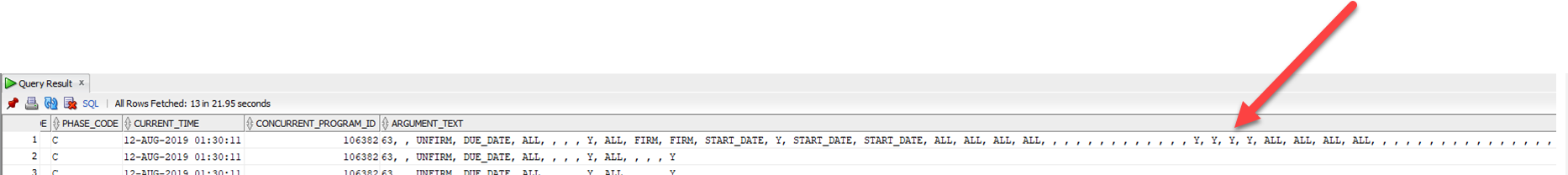 When looking in the APPS database, we observe this abnormally high and duplicated Arguments for the new Executions performed via Dollar Universe: