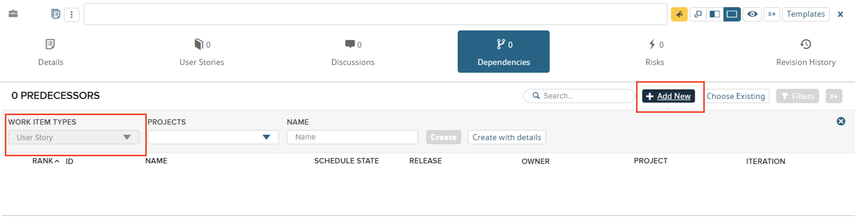 When trying to associate a predecessor or successor dependency, the wrong work item type is displayed and cannot be changed. This can happen on various work item types, such as User Story details or a Portfolio Item details. The Work Item Types field is incorrect and grayed out as seen below: