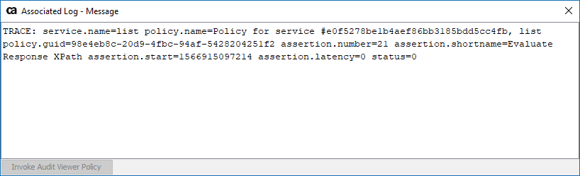 TRACE: service.name=${trace.service.name} policy.name=${trace.policy.name} policy.guid=${trace.policy.guid} assertion.number=${trace.assertion.numberstr} assertion.shortname=${trace.assertion.shortname} status=${trace.status}