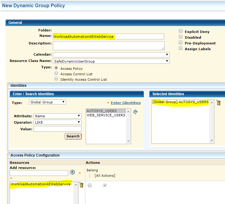 Under "Access Policy Configuration", add a resource called "WorkloadAutomationAEWebService" by typing it in the "Add resource:" field and clicking the "+" to the right of it.