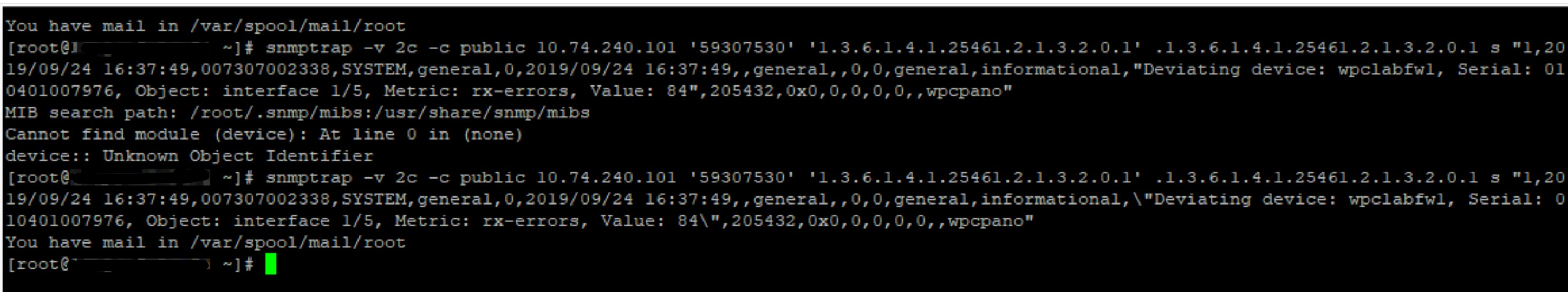 $snmptrap -v 2c -c public 10.74.240.101 '59307530' '1.3.6.1.4.1.25461.2.1.3.2.0.1' .1.3.6.1.4.1.25461.2.1.3.2.0.1 s "1,2019/09/24 16:37:49,007307002338,SYSTEM,general,0,2019/09/24 16:37:49,,general,,0,0,general,informational,\"Deviating device: wpclabfw1, Serial: 010401007976, Object: interface 1/5, Metric: rx-errors, Value: 84\",205432,0x0,0,0,0,0,,wpcpano"