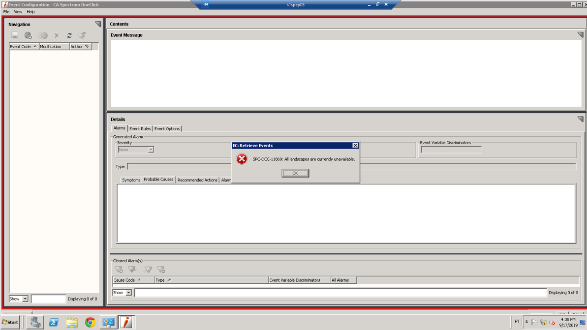 Error "SPC-OCC-11869: All landscapes are currently unavailable" is displayed in Event Configuration Editor on two OneClick web servers.
