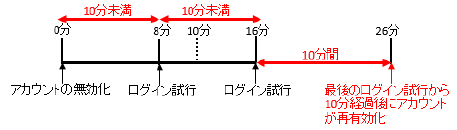 16分後のログイン試行からさらに10分経過後、アカウントが無効となってから26分後となります。