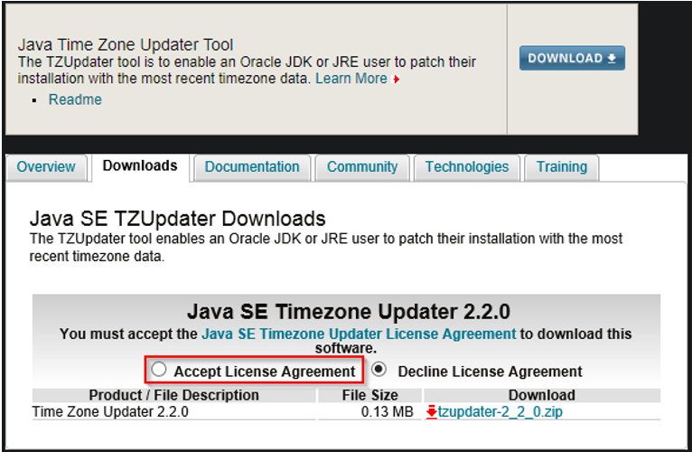 OBS: The "tzupdater.jar" file is extracted from tzupdater-2_2_0.zip file, which can be downloaded from the following Oracle site: