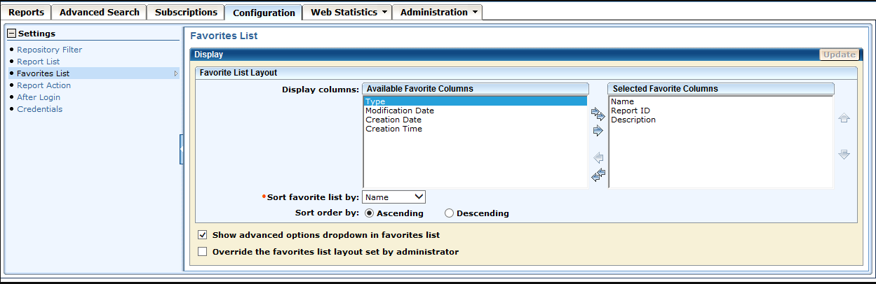 - In the Configuration tab->Reports List->Favorites List there is a Checkbox option for "Show advanced options dropdown in report list"