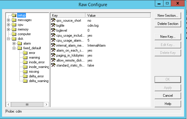 Once you have "repaired" the cdm.cfg file on your problematic robots, double check to make sure that the <fixed default section still exists in the <disk> section. You can do this by opening the cdm probe's Raw Configure GUI and expanding the disk folder in the left-hand pane. The fixed_default folder should be there and populated with the default values for this section: