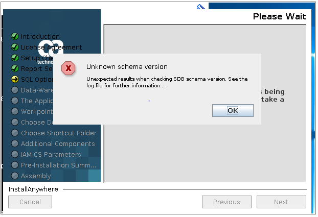 Unexpected results when checking SDB Schema version. See the log file for further information...
