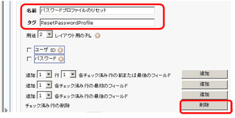 9. [ユーザID]、[パスワード]以外の属性にチェックし、[削除]をクリックして不必要な属性を削除します。