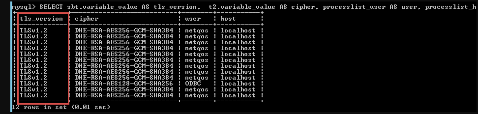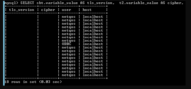 SELECT sbt.variable_value AS tls_version, t2.variable_value AS cipher, processlist_user AS user, processlist_host AS host FROM performance_schema.status_by_thread AS sbt JOIN performance_schema.threads AS t ON t.thread_id = sbt.thread_id JOIN performance_schema.status_by_thread AS t2 ON t2.thread_id = t.thread_id WHERE sbt.variable_name = 'Ssl_version' and t2.variable_name = 'Ssl_cipher' ORDER BY tls_version;