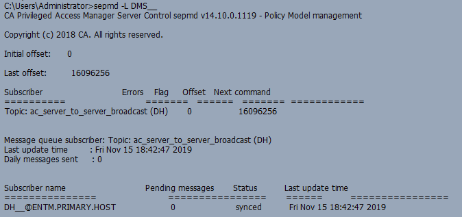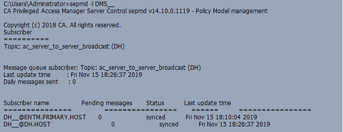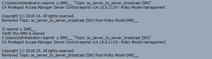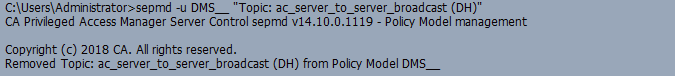 2) sepmd -u DMS__ "Topic: ac_server_to_server_broadcast (DH)" (This will remove all server to server message queue subscriptions)\
