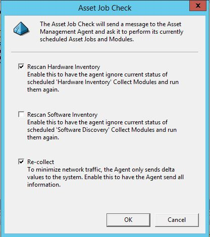 Asset Jobs > Activate Job Check > select "Rescan Hardware Inventory" and "Re-collect"
