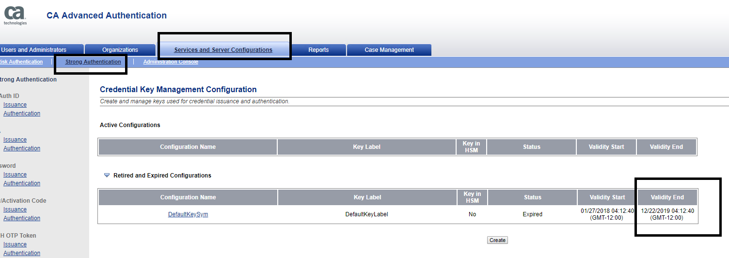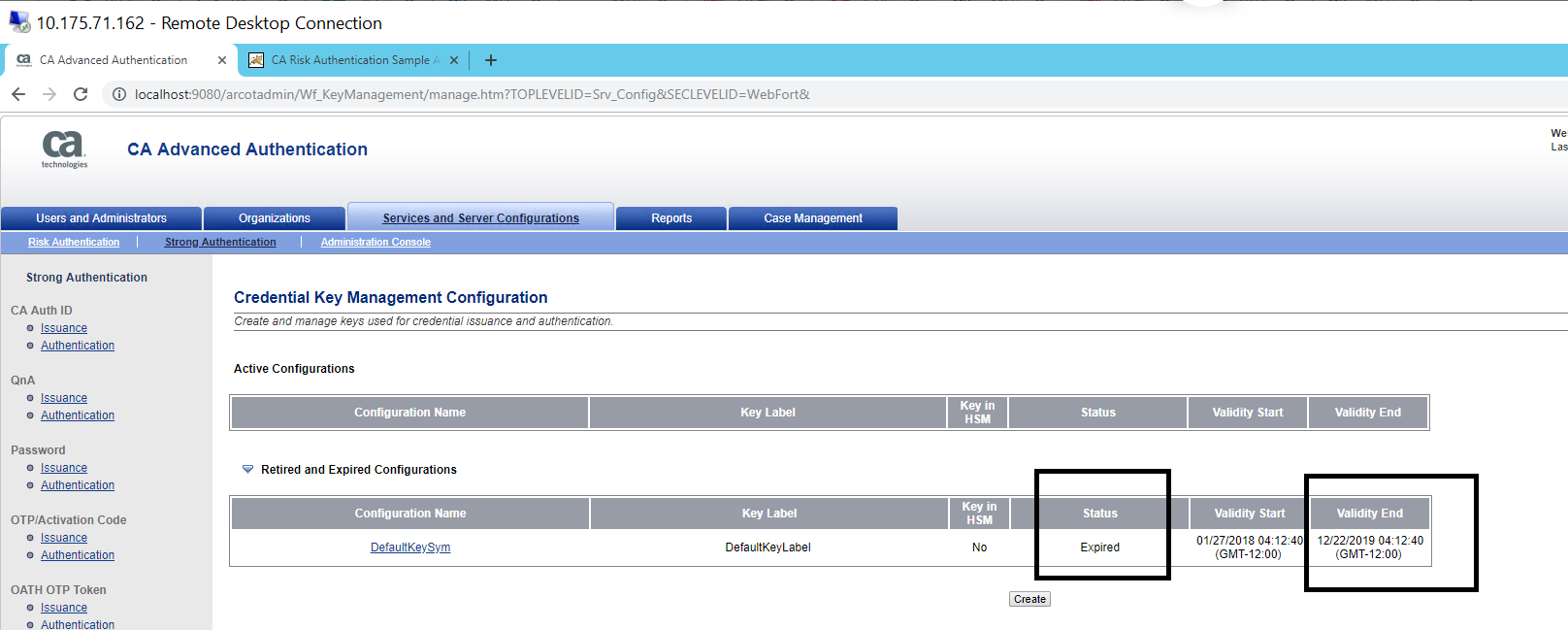 4. Credential Key management and look for the validity end date of the default Domain key (in the Admin UI screen shot below 12/22/2019). Make note of this date. The screen shot below shows validity expired on 12/22/2019 and note this key is marked with status as "Expired".
