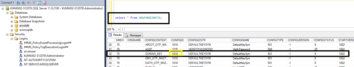 2. Go to Strong Auth database and look for table ARWFORGCONFIG. Note down the “CONFIGID” where CONFIGCONTEXT is “DOMAIN_KEY” and CONFIGIDSTR value as DEFAULTKEYSYM and CONFIGNAME as DefaultKeySym. In this example “CONFIGID” is 1018.