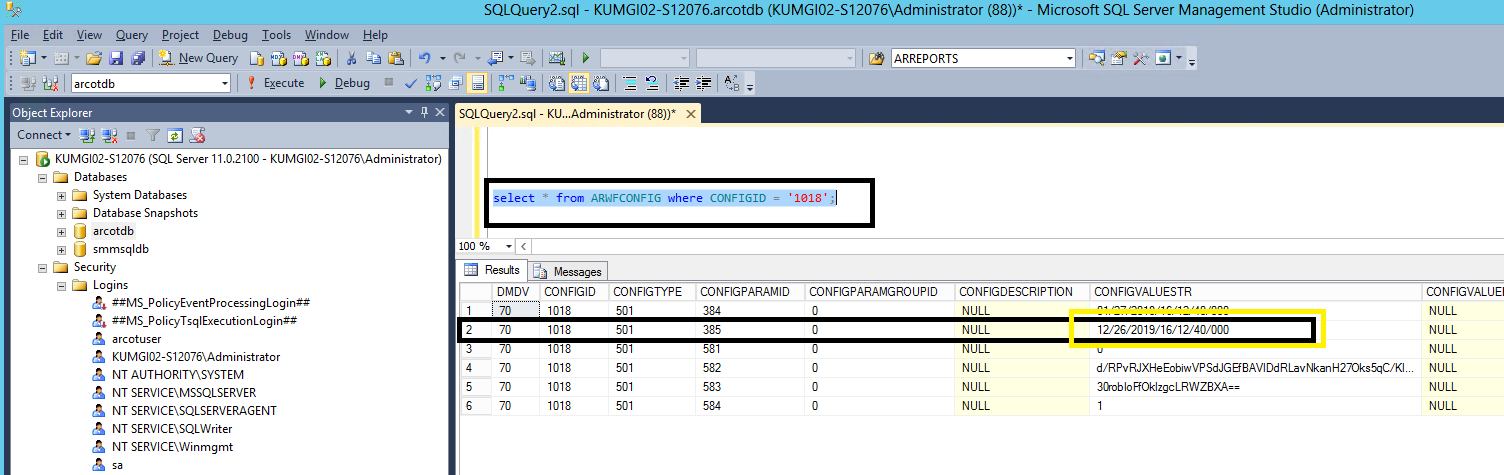3. Look for the value of CONFIGID (in this example “1018”) in ARWFCONFIG table and the expired date as in this example “12/26/2019” (in column CONFIGVALUESTR). This is the row we will be updating to extend the validity of the expired Domain Key