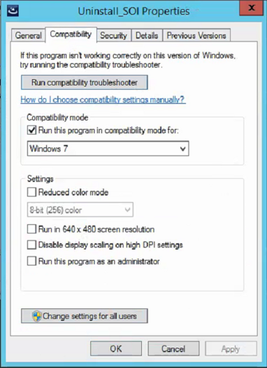 You need to set Compatibility Mode to Windows 7 for CA\SOI\uninstall\Uninstall_SOI\Uninstall_SOI.exe, see following screen shot on how to set it