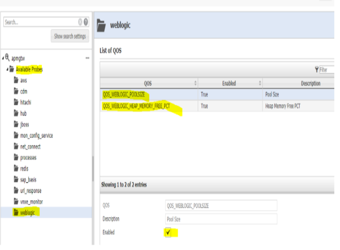 4. Expand and then click on the weblogic probe and the defined QoS should be visible in the GUI.