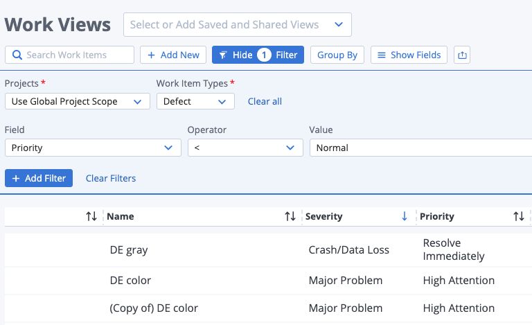 However when a filter is applied to defects where 'Priority < Normal' the following is the result;