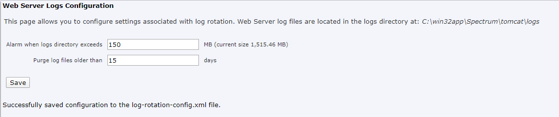 The SizeCheckerTask job checks the size of $SPECROOT/tomcat/logs starts when restarting Tomcat, or clicking the [Save] button in the [Web Server Logs Configuration] section of the Spectrum Administration page. That is performed hourly intervals.
