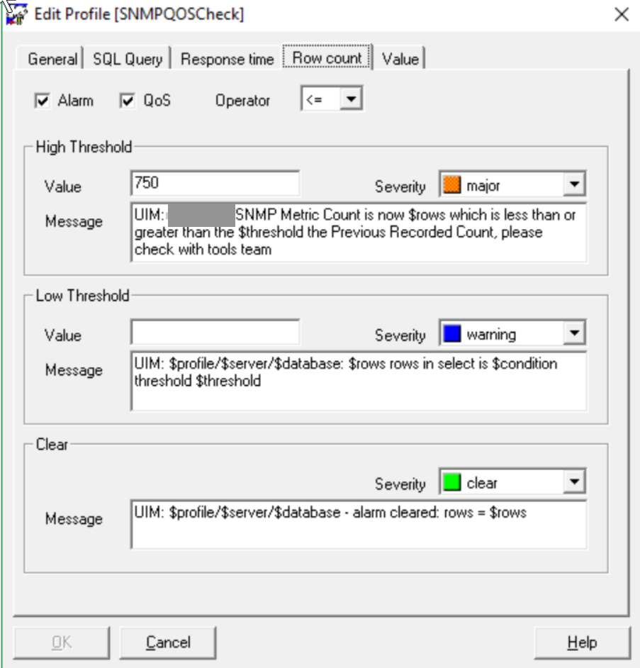 9. Click on the Row count tab, Enable Alarm , QOS, Operator and Threshold (rows returned in the sql query).
