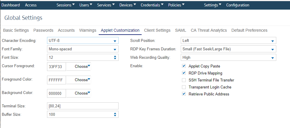 Web Recording Quality: Specify the color depth and frame rate to use when recording a web portal session: