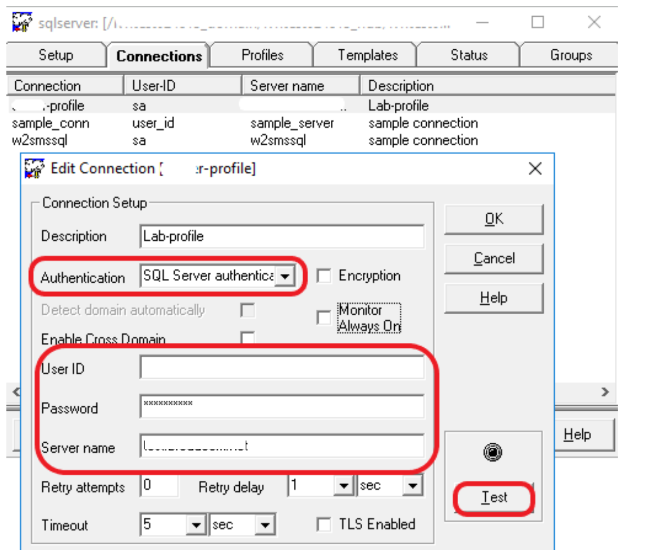 sqlserver: Profile: test connection profile/test connection checkpoint/Connect - DB Provider: Code=0x80004005 Source=Microsoft OLE DB Provider for ODBC Drivers Description=[Microsoft][ODBC SQL Server Driver][DBNETLIB]ConnectionOpen (SECDoClientHandshake()).