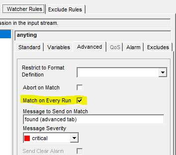 Logmon's Match on Every Run option enables the probe to match values for the specified format rule each time a log file is scanned.