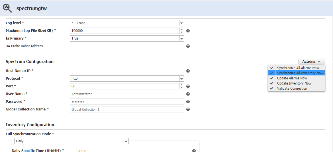 1. Deactivate spectrumgtw probe 2. Delete the InterfaceCache.dat and InventoryCache.dat from the %Nimsoft\probe\gateway\spectrumgtw\cache folder 3. Activate spectrumgtw probe 4. Perform Synchronize All Inventory Now