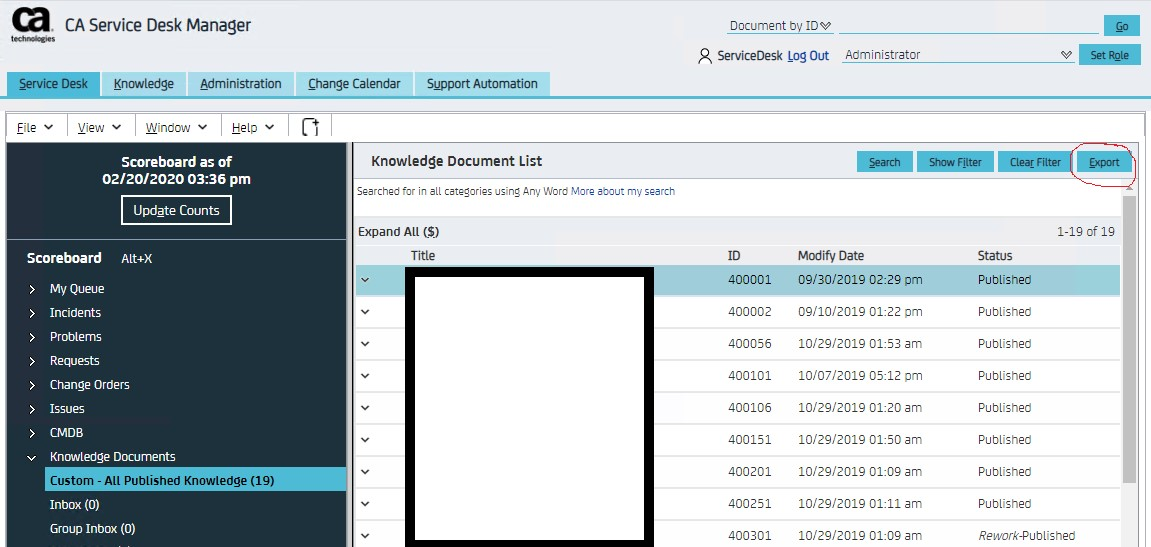 Warning: Keep in mind that whenever the action is taken to list/export the KB documents, there may be an impact to SDM system performance and so it is best to only take the action outside of normal working hours to avoid impact to other SDM users.