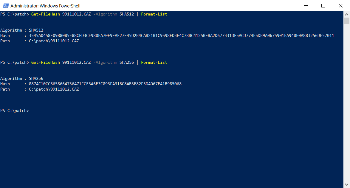 Get-FileHash 99111012.CAZ -Algorithm SHA512 | Format-List