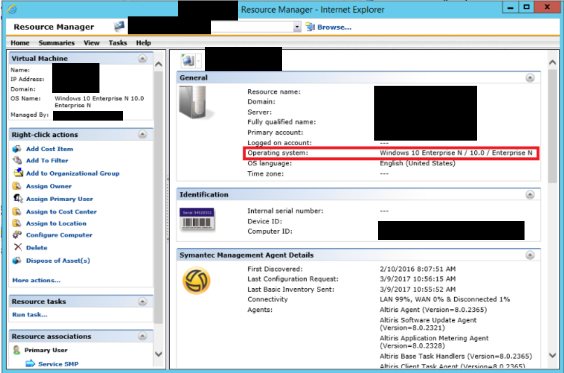 The Operating System details for a computer under the Resource Manager are populated mainly from information collected via Basic Inventory. Those details are pulled from the Inv_AeX_AC_Identification data class.