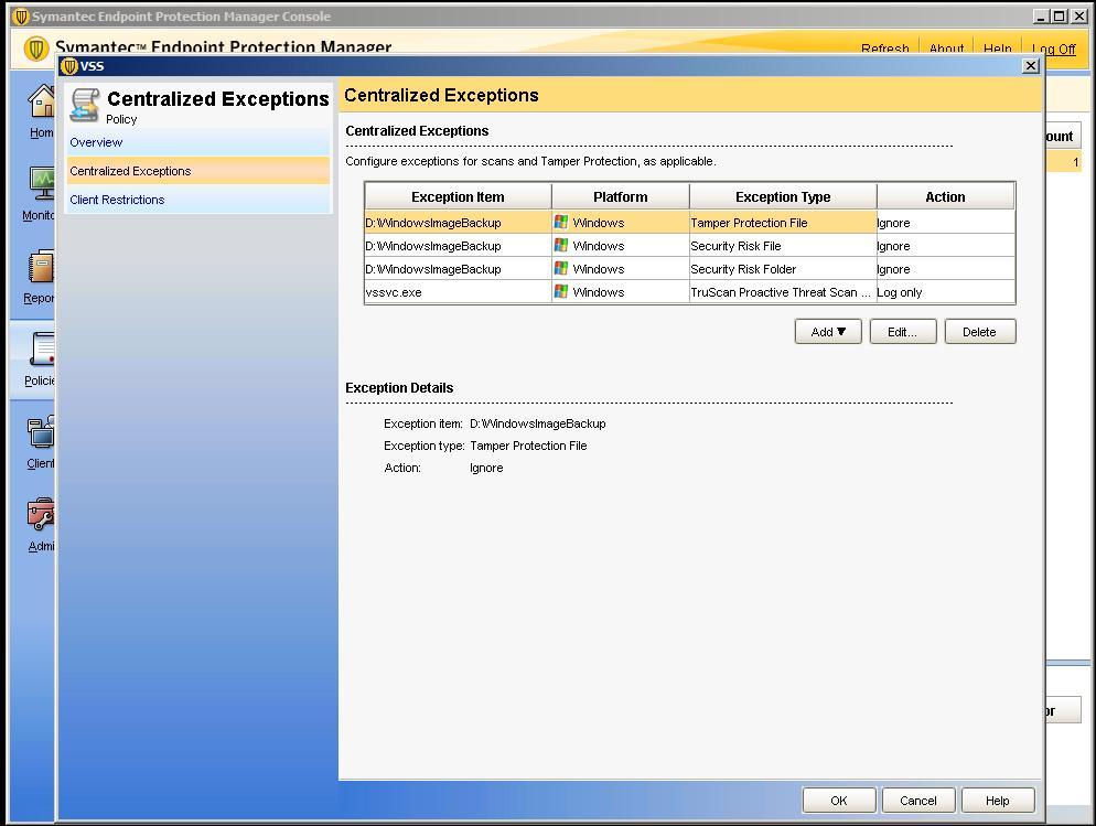 Because you can not set the exclusion using string: (D:)\\?\Volume{433499a2-7c73-11e0-b7e0-000c29d393e5}\ or \\?\GLOBALROOT\Device\HarddiskVolumeShadowCopy4\ the following exclusions must be created: