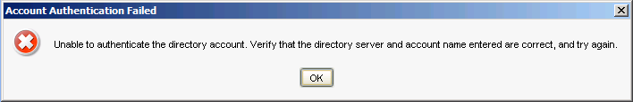 Unable to authenticate the directory account. Verify that the directory server and account name entered are correct, and try again.