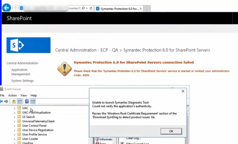 (3) The Symantec application root certificate (DigiCert) for the Sharepoint's Protection Engine was removed or expired. This is a certificate used to authenticate most all Symantec product applications before execution.
