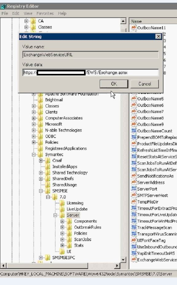 (SMSMSE 7.5 & Earlier) HKEY_LOCAL_MACHINE\SOFTWARE\Wow6432Node\Symantec\SMSMSE\<version>\Server