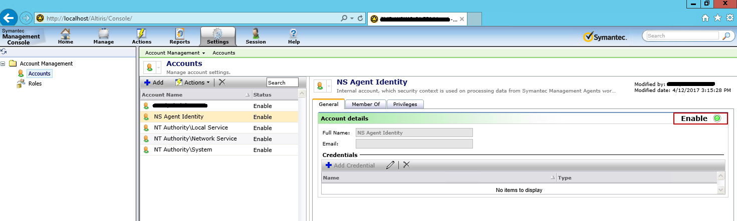 Settings>Security>Account Management>Accounts>NS Agent Identity