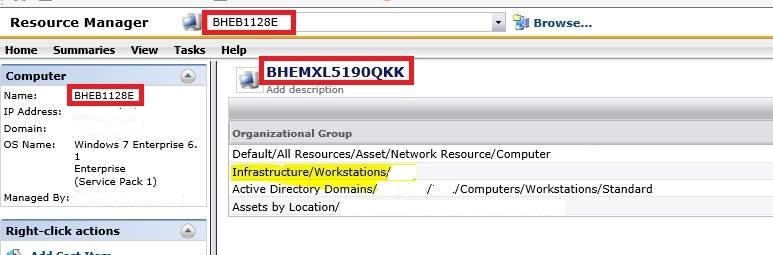 Searching for a computer name in Resource Manager does not show the expected results. This happens on computers that were reimaged or renamed. In this example, the new name should be BHEMXL5190QKK, however it also shows the old machine name BHEB1128E in some areas of Resource Manager: