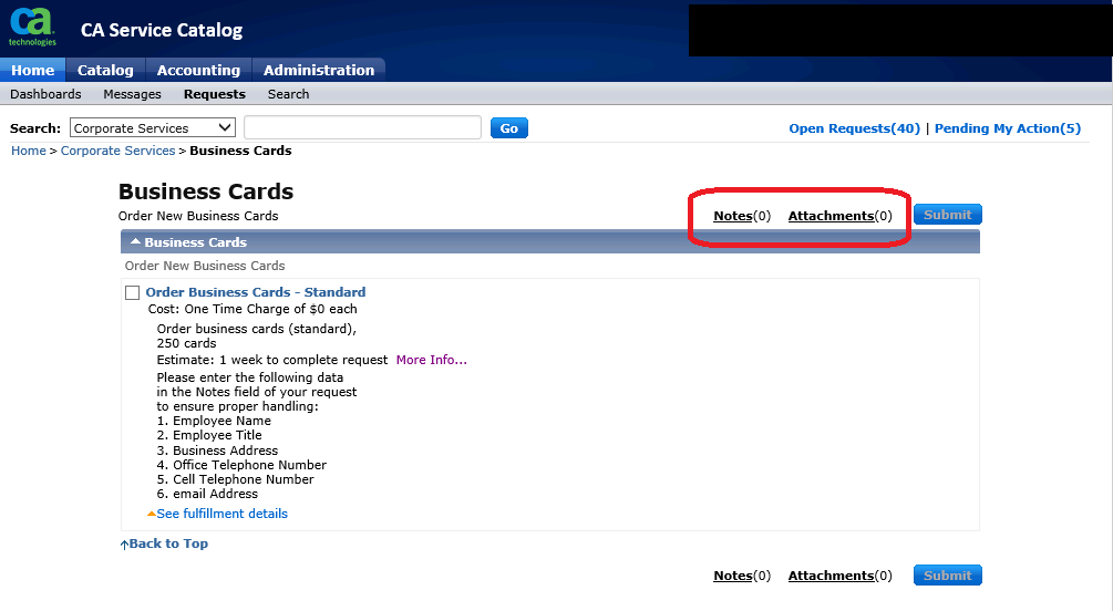 When a service offering is configured to use one-click submit rather than the shopping cart, attachments and notes must be added before the request is submitted. This is because there is no shopping cart stage where notes and attachments can be added.