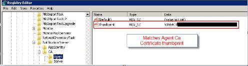 The thumbprint in the registry should match the thumbprint of the Agent CA certificate located in the trusted root certificate store. If the certificate is missing from the store you will see the error. If you have a backup of the certificate you can restore it and it should work. If you dont, you will have to run aexconfig and reconfigure the server to generate a new one. This will create a new certificate. However, If this is an existing environment you will have to put this new certificate on any existing machines. Any existing CEM machines would have the old certificate and will to have this updated certificate.