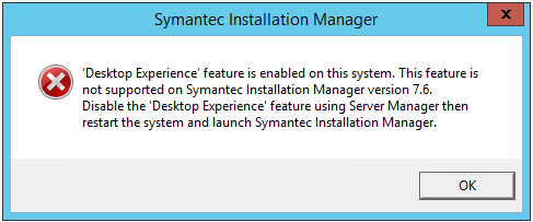 'Desktop Experience' feature is enabled on this system. This feature is not supported on Symantec Installation Manager version 7.6x. Disable the 'Desktop Experience' feature using Server Manager then restart the system and launch Symantec Installation Manager.