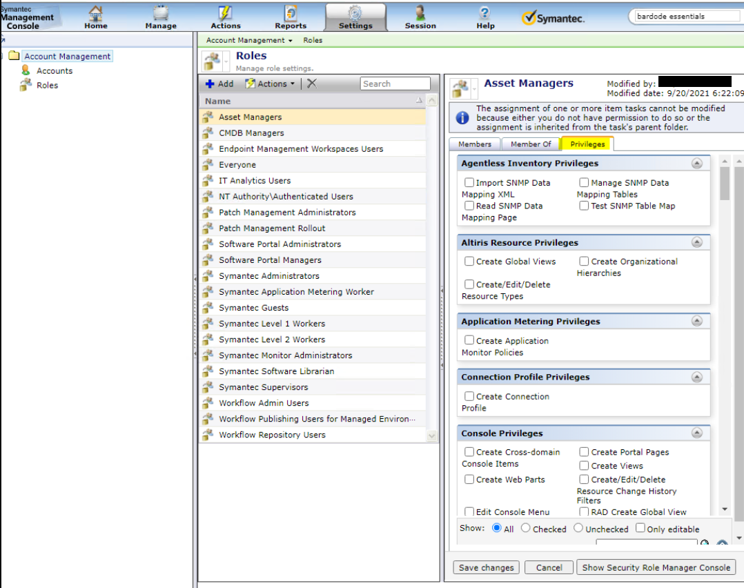 The following screenshot shows how easy it is to see the Management Privileges assigned to each role: