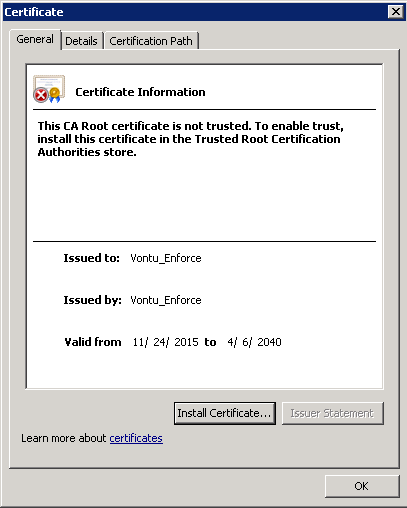 You can then open the exported Certificate .cer file in your system and view in the General tab the validity period which by default (v12.5) is approximately 35 years.