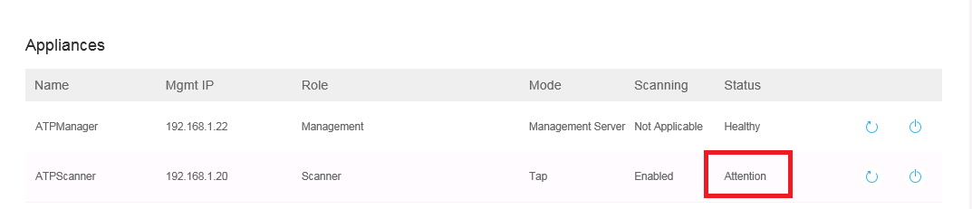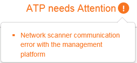 If the ATP Scanner Appliance has not been restarted within 30 minutes, an "ATP needs Attention" status will be displayed.