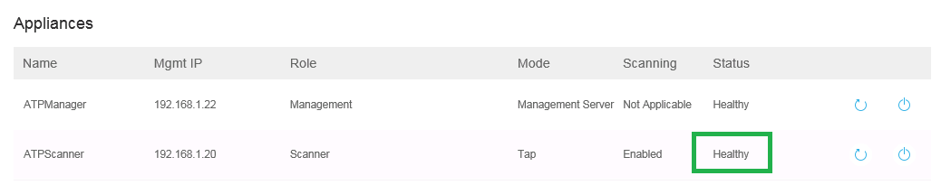 When an Advanced Threat Protection (ATP) Scanner Appliance has been shutdown from a console command prompt or the Advanced Threat Protection (ATP) Web Interface, its status will remain Healthy for up to 30 minutes.