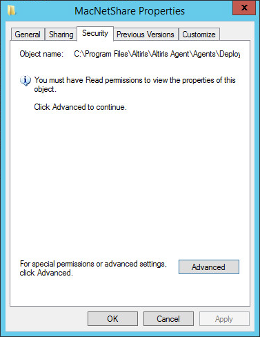 Note: Because there are no permissions on the MacNetShare folder, executing the 'Symantec_DeploymentSolutionSBS_8_x_x64.msi' will fail.