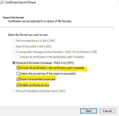 ** Make sure the certificate has the private key. There should be a 'Key' on the certificate in the folder you get back up from. If there is no key, open the GW manager, in the General tab open the Web Certificate, go to the Details tab, and click Copy to File button. Choose export private key and then the following three options.