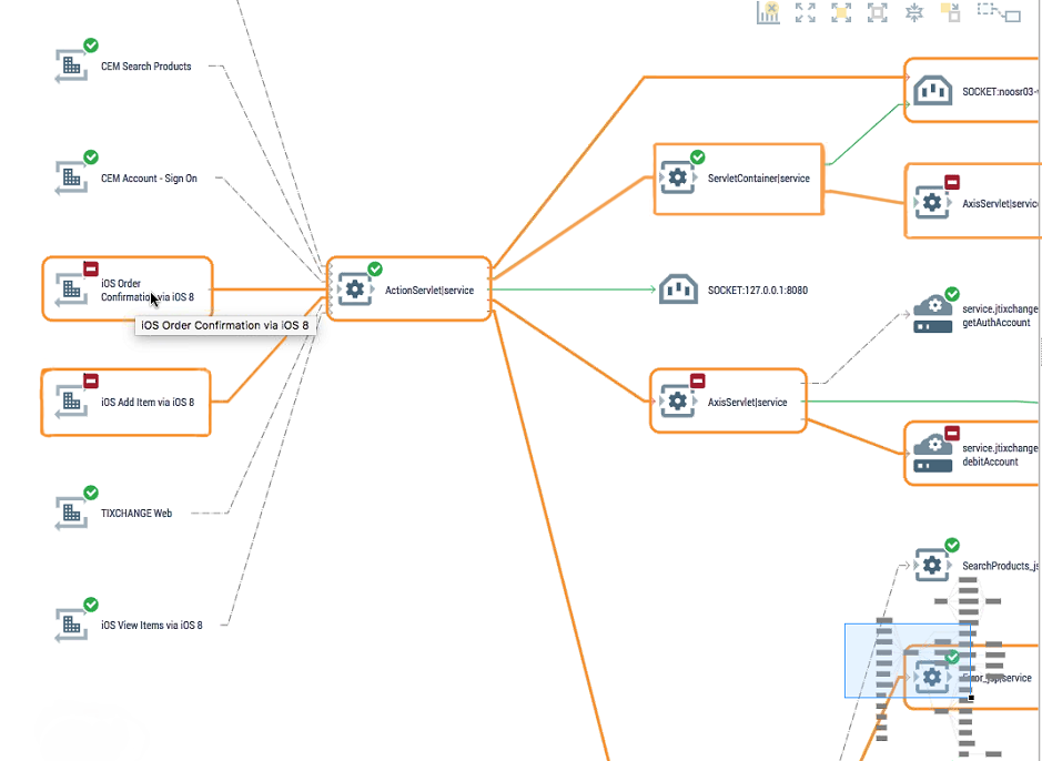 1. Problems and Anomalies - This is probably the most misunderstood part of the card. Where do problems and anomalies come from? Is a problem an anomaly? Is an anomaly a problem? Using the below map, you can see there are 3 red icons on the right and 2 red icons on the left (separated by ActionServlet|service in the middle). The map is drawn from transaction traces. If no transaction traces exist, then no map is drawn.