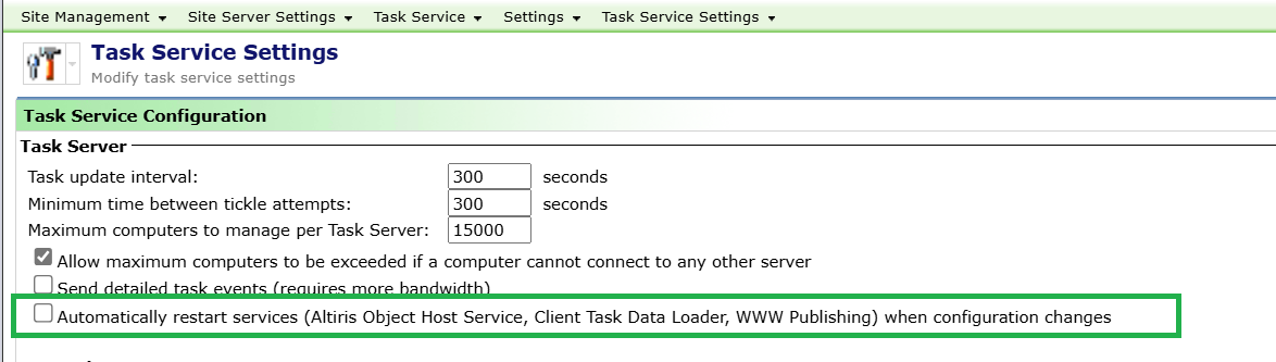 "Automatically restart services (Altiris Object Host Service, Client Task Data Loader, WWW Publishing) when configuration changes"