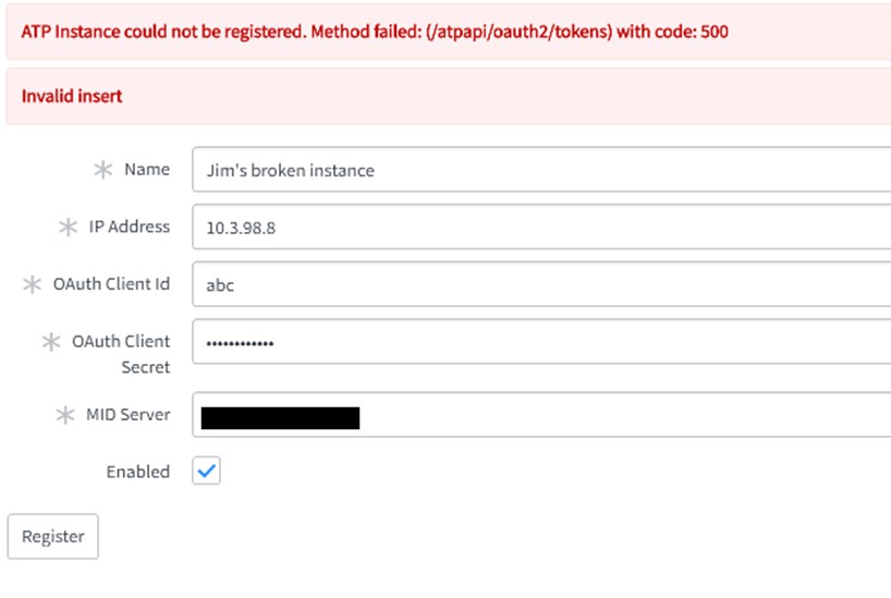When registering your ATP manager in ServiceNow, you receive an error regarding an invalid insert