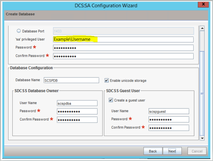 Only use the "sa" privileged account in the user field with no special characters or numbers until this known issue is addressed in the DCS 6.7 MP1 release.